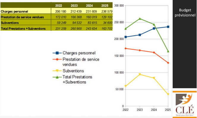 Le déficit prévu pour 2025 est considérable : – 70 000 € (sur un budget de 280 000 €). Il pourrait encore augmenter, car il tient compte de demandes d’appels à projets et de subventions pour lesquelles les réponses peuvent être positives ou négatives.